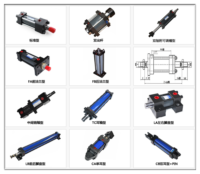 標準型、雙出桿、雙軸附可調帽型、FA前法蘭型、FB后法蘭型、中間銷軸型、TC耳軸型、LA左右腳座型、LB前后腳座型、CA單耳型、CB雙耳型+PIN。