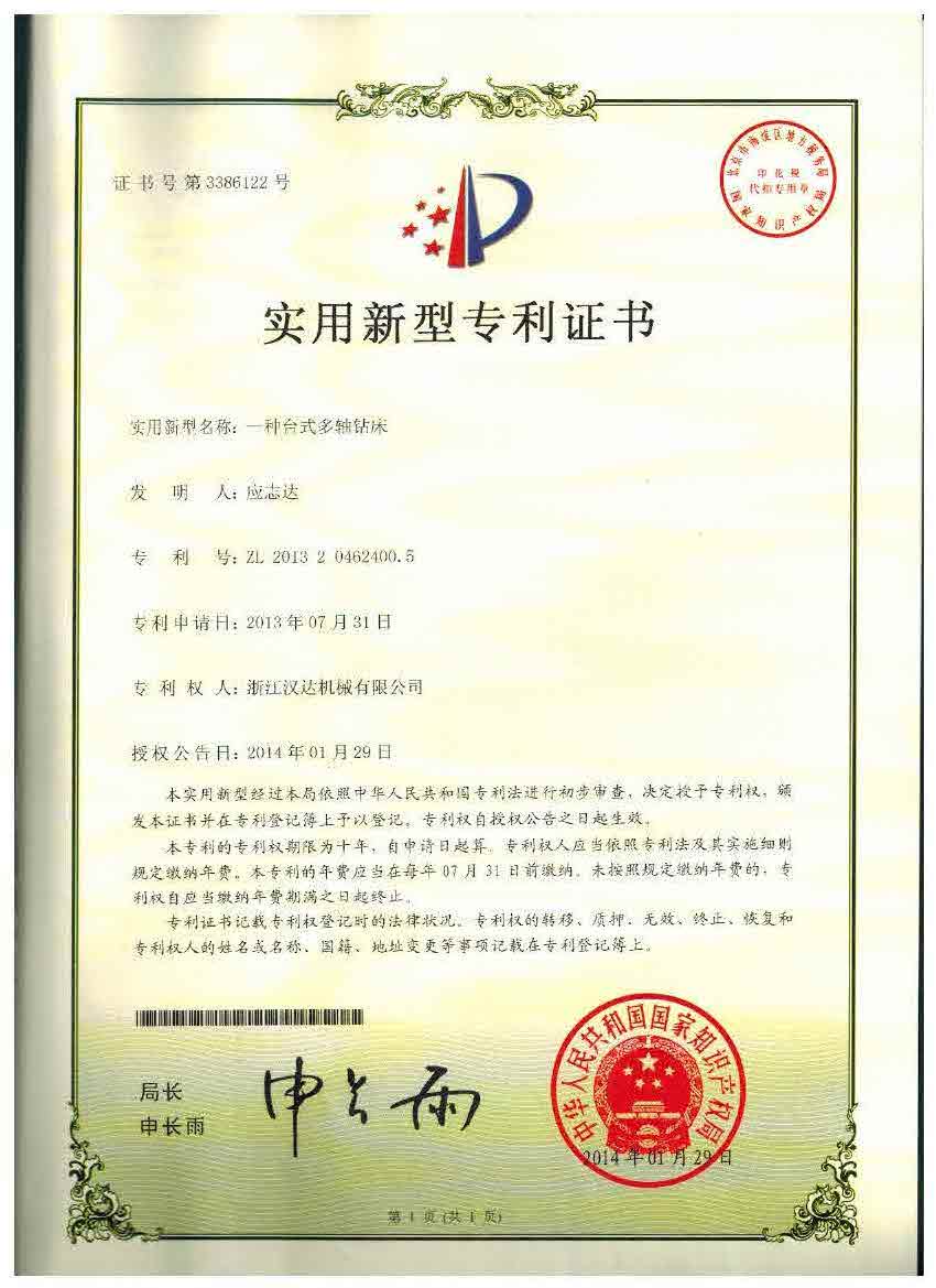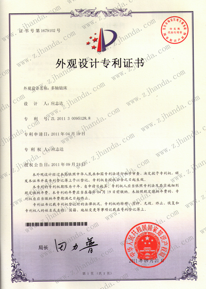 多軸鉆床外觀專利證書