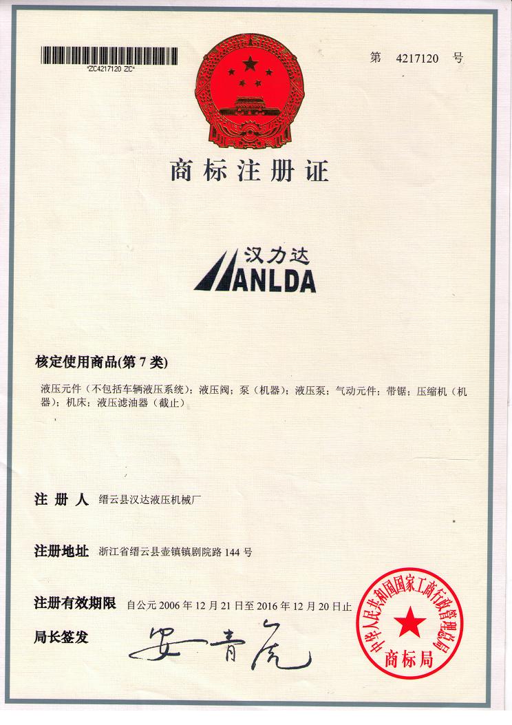 漢力達商標注冊證書